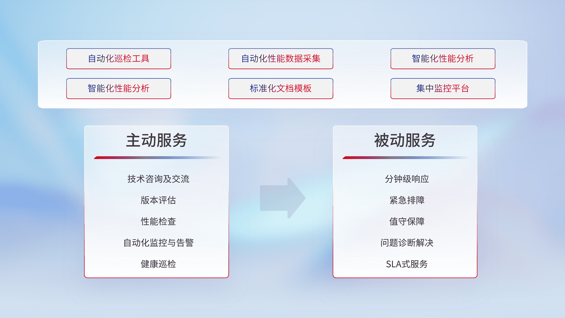 智能化工具和标准化文档,,,,保障服务质量,,,提供主动服务(包含技术咨询、、、、版本评估、、、、性能检查、、、自动化监控与告警、、、、健康巡检)和被动服务包含(分钟级响应、、、、紧急排障、、、值守保障、、、问题诊断解决、、、SLA服务)。。