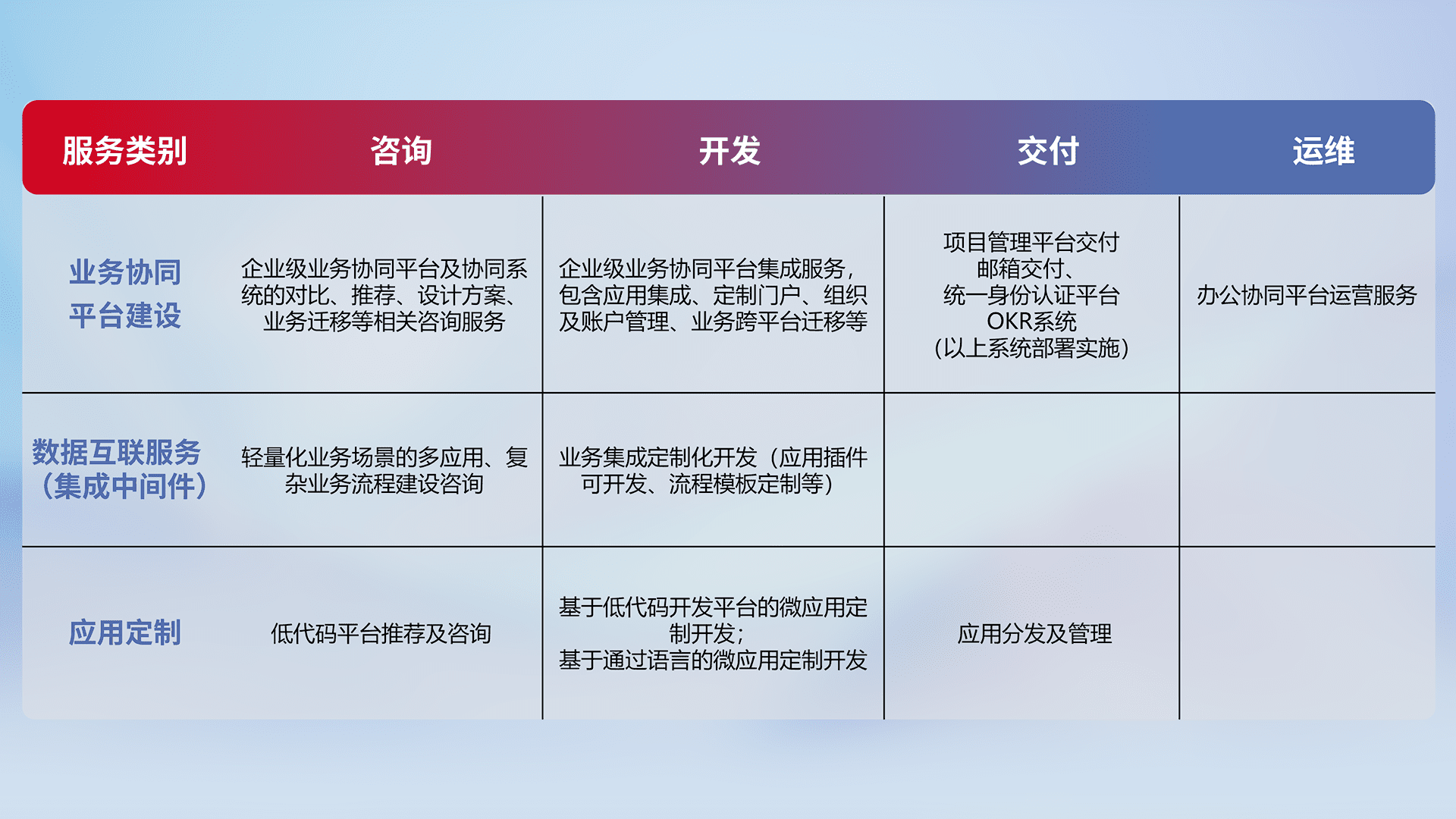 针对钉钉、、、企微、、、IDaas等平台级产品提供产品的规划、、方案、、、、交付、、、定制化开发等服务,,,,实现如统一协同办公、、、智能客户服务、、、混合会议管理、、、智能数据查询、、等业务场景,,实现数字化转型。。。